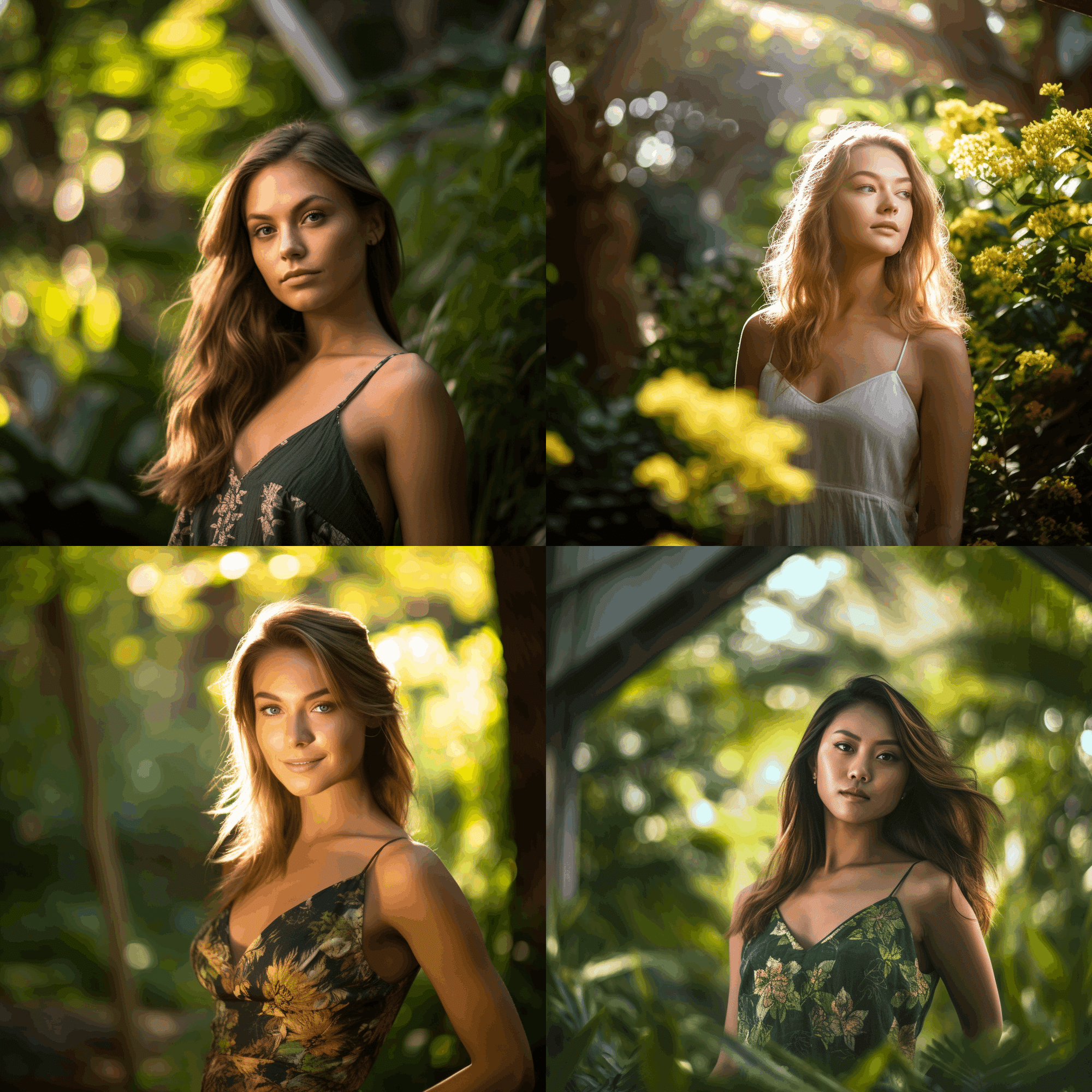 木々がそびえ立つ静かな森で、柔らかな光の中、アンビエントディフューズドライトで影を和らげながら撮影。自然体でゆったりと座り、心地よさを感じさせるポーズで、不思議な感覚を呼び起こす夢心地の気分を力強く伝え、現代のファッションを表現した上品なシックの服装で、魅惑的な女性の屋外ポートレートを撮影しています。